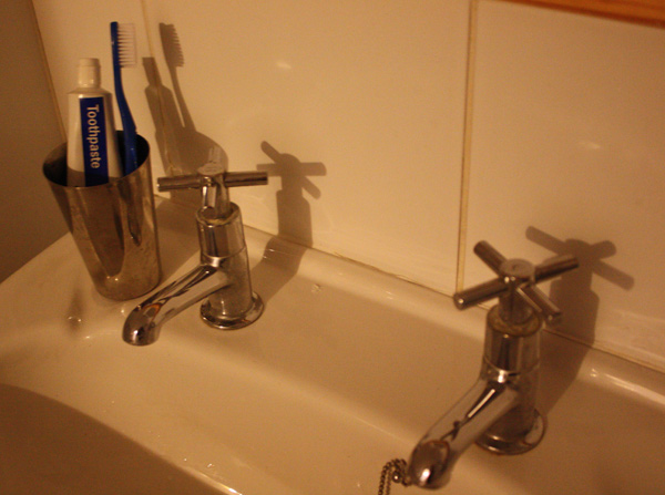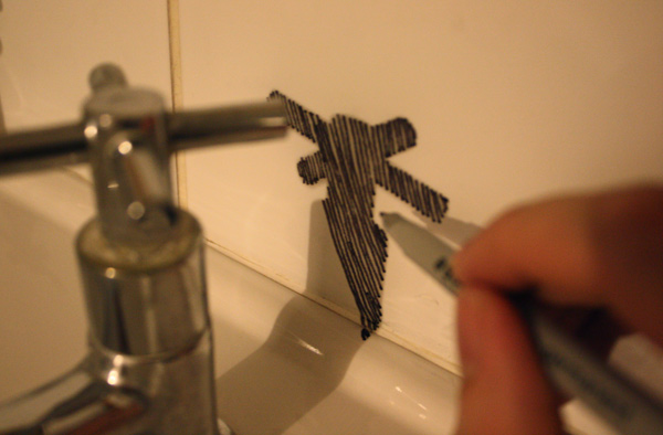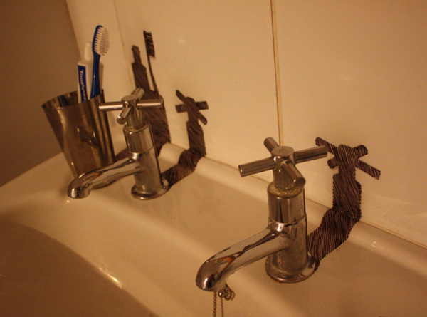 I was in the bath and thinking what to do for the Speed Creating project. I looked at the taps and saw that they had a strong shadow behind them cast by the hallway light through the open door. I’ve always thought shadows were interesting. I decided I would make them more permanent by drawing over them. I would like to do something larger on a wall somewhere.