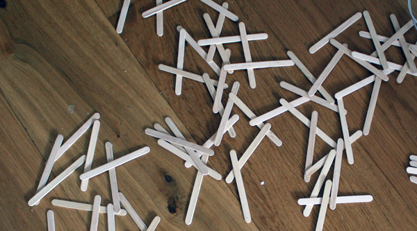 I bought packets of ice lolly sticks from a craft shop and arranged them on the floor. I liked the random pattern and decided to glue them together.