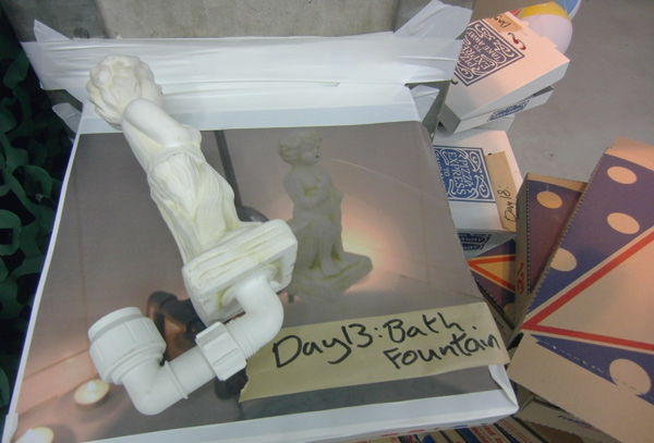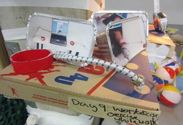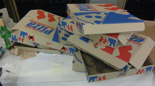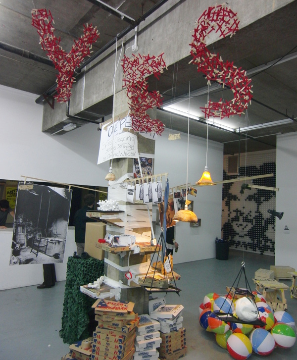 On visiting the space I saw some pizza boxes used by some people the previous night. I asked if anyone was using them and they werent. I thought that the fast food nature of the boxes fitted with ‘speed creating’ and so I would make some shelves from them.