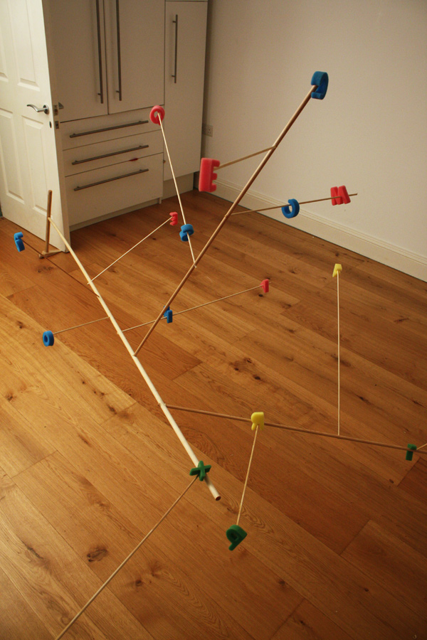 The door stop is a modest thing, quietly getting on with it’s job of keeping the door open. I decided to attempt to reveal it’s true inner strength. Using lengths of wood I extended out from the door stop across the room. The extension does not touch the floor, it is purely supported by the solitary door stop and the strength of it’s wedge under the door.