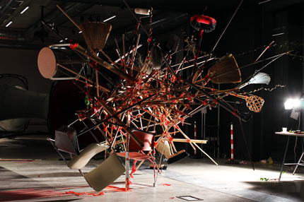 The idea I came to Milan with was to build a bridge of sticks between two chairs but I changed my mind and wanted to build on one chair with only the legs of the chair touching the ground. I wanted to see how far I could push the strength of the tape and balance of the chair.