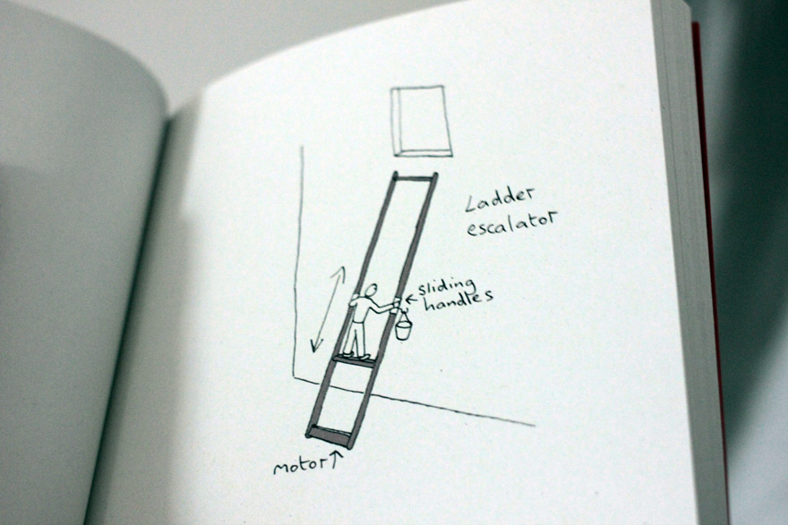 My book of invention ideas seems to be selling well, about two thirds through the 1000 printed. I had a lovely comment from Thomas Heatherwick, designer of the London olympic cauldron amongst other brilliant things. He kindly wrote, “Dominic Wilcox’s drawings aren’t just witty and beautifully drawn, they are serious challenges to the real world to keep looking at itself with innocent eyes, wondering what else is possible” He mentioned a favourite of his was the motorised ladder below.